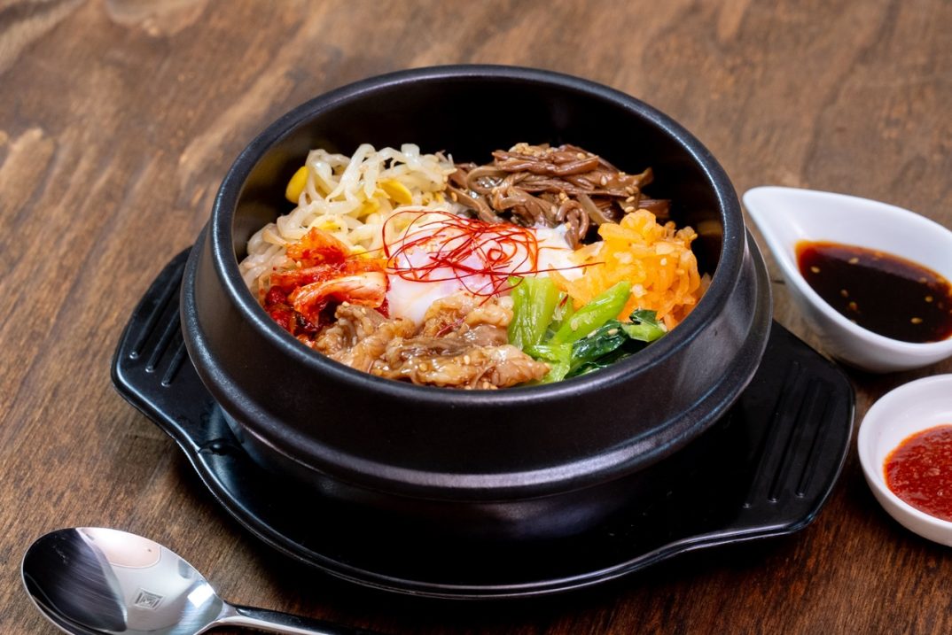 ご飯の上にナムルやお肉、卵を彩りよく盛り付け、特製コチュジャンを加えてよく混ぜていただきます。