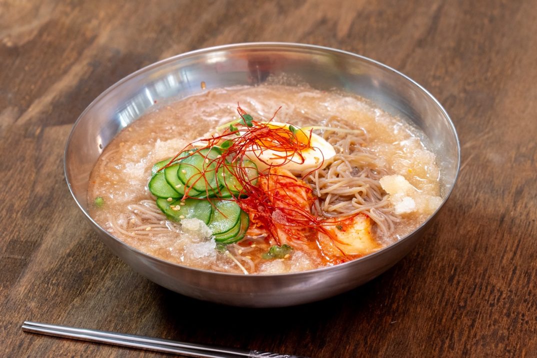 キュウリや白菜キムチ、ゆで卵などを添え、爽やかな酸味と旨味のバランスが食欲をそそる一品です。