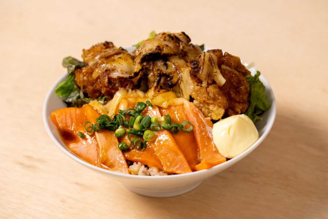 ・【アヴァントミズノ考案】炙りチーズ&マシマシ焦がしニンニク醤油のトリからサーモン丼 ¥1,480(税込)