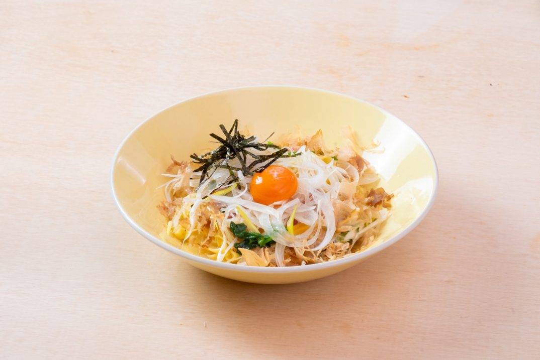 たっぷりの鰹節とシャキシャキの白髪ネギを山盛りに。中央に鎮座する濃厚な卵黄を崩せば、クリーミーなソースに和の旨味が溶け出します。