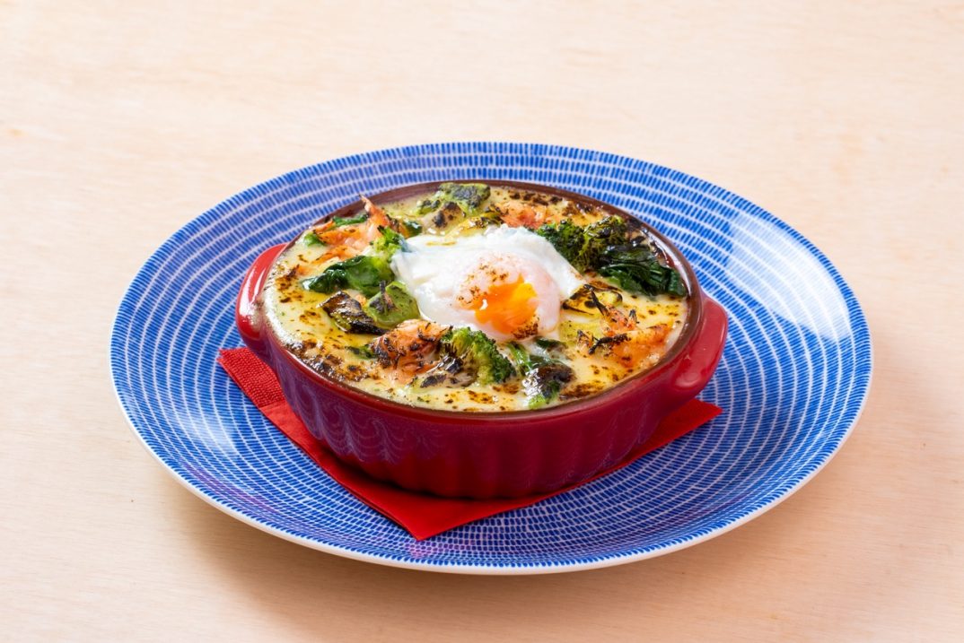 鮮やかなジェノベーゼソースに、たっぷりのチーズと温玉をのせて焼き上げました。春の訪れを感じる、華やかでクリーミーな一皿です。